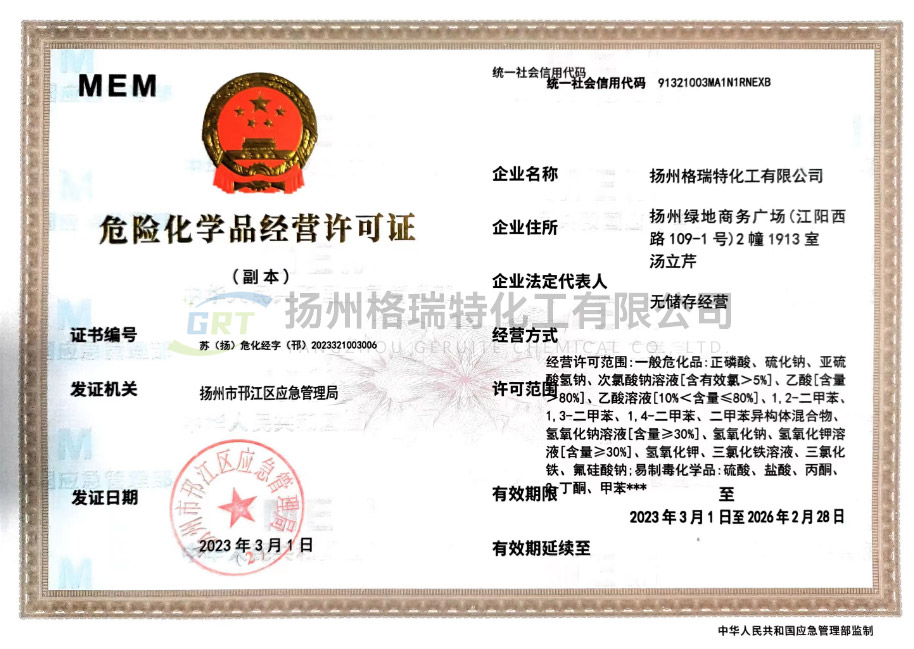 揚州格瑞特化工有限公司生產工廠坐落于江蘇省海安縣胡集工業園區和海安精細化工工業園??偣境闪⒂?999年,是集科、工、貿為一體的現代化生產型企業。專業致力于水處理劑、紡織印染助劑、化纖油劑等產品的科研、開發、生產和銷售??偣菊嫉孛娣e40000m,建有現代化標準廠房,擁有先進的生產設備。年產各類水處理劑系列產品12000噸,紡織印染助劑5000噸,產品12個系列40多個品種。總公司注重技術投入,設立產品研發中心和環保運營中心,聘請了多位專家為公司技術顧問,并和多個重點院校建立了長期技術合作開發關系,是南通大學、江南大學、南京工業大學產學研基地。
